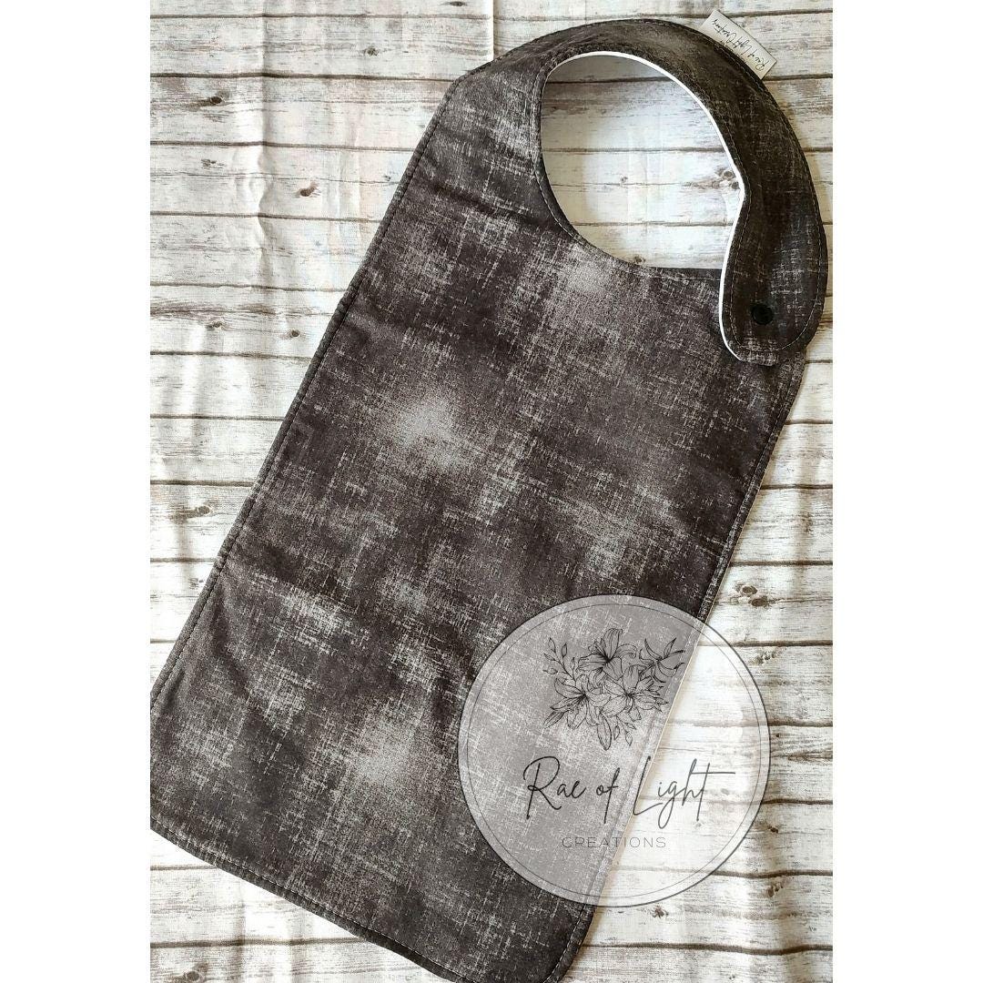 Bibs are made up of 100% cotton top layer, inner layer is 100% polyester fleece, and the bottom layer is PUL waterproof lining (83% Polyester, 15% Polyurethane, and 2% Agglutinant). These bibs are approximately 11"W x 14"H front and 24" from bottom to top of neck strap. The neck strap is attached with a plastic snap for your loved ones safety. The snap is placed in the front so as not to irritate your loved ones skin on the back of the neck. This bib is longer than your average bib to protect your loved ones clothing. These bibs fit older children to adults. Can be used in a variety of settings. These bibs not only keep your loved ones dry and clean, but they are fashionable too!